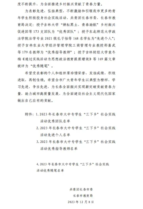 近日,共青团长春市委、长春市教育局发布《关于表彰 2023 年长春市大中专员工“三下乡”社会实践活动优秀团队和个人的决定》,公司“牢记服务使命”党史学习实践团获评2023年长春市大中专员工“三下乡”社会实践活动优秀团队、农艺与种业2022级研究生张鹏获评2023年长春市大中专员工“三下乡”社会实践活动先进个人、团委书记刘鑫鑫获评2023年长春市大中专员工“三下乡”社会实践活动优秀指导教师。